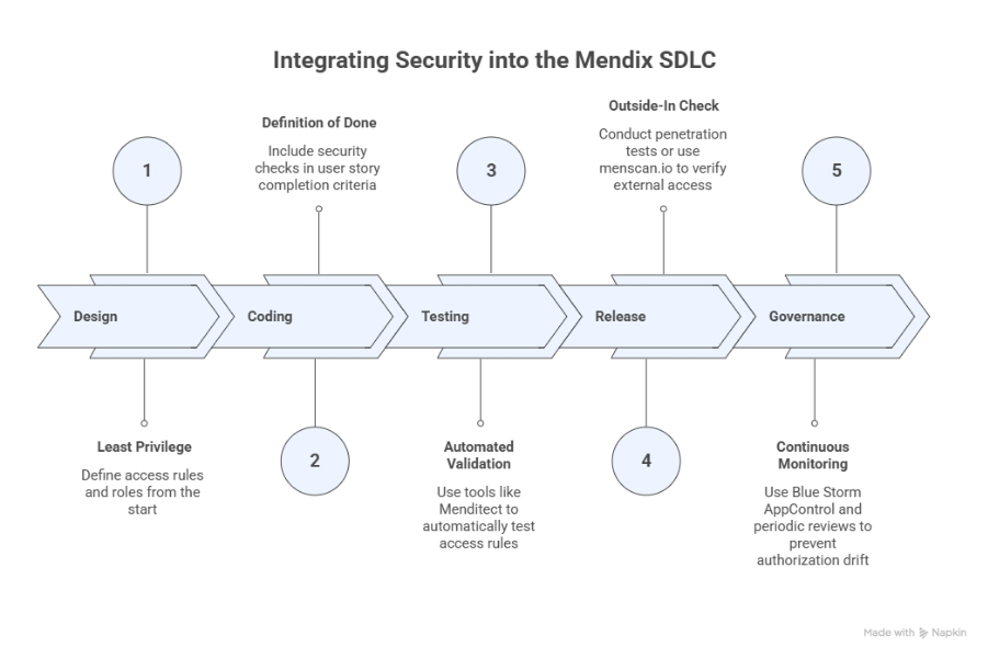 A one-time check at release is not enough. Authorization drift occurs between releases: new modules, copied configurations, silent role changes. Blue Storm’s AppControl continuously monitors the entire Mendix portfolio. It scans both the project model and deployed apps, enforces centrally defined security policies through pipeline checks, and flags drift before it reaches production. Supplemented with a periodic access review (especially after team changes or major functional expansions), governance becomes a strong feature of the landscape.