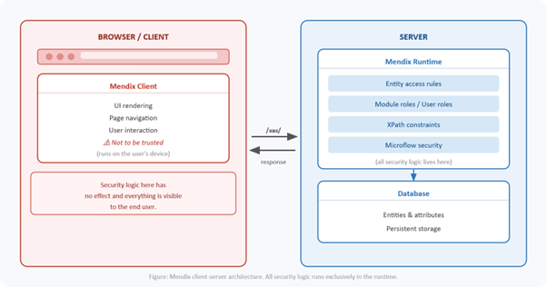 The security logic is solely in the runtime. Entity access rules, module roles, user roles and XPath constraints determine what a user is allowed to request and see. Mendix is explicit about this: the client is by definition not to be trusted. Anything running on the user’s device is outside of the server’s control. That’s not a shortcoming of the platform; It is a conscious architectural choice, and a correct one. In fact, it is one of Mendix’s strengths over alternatives.